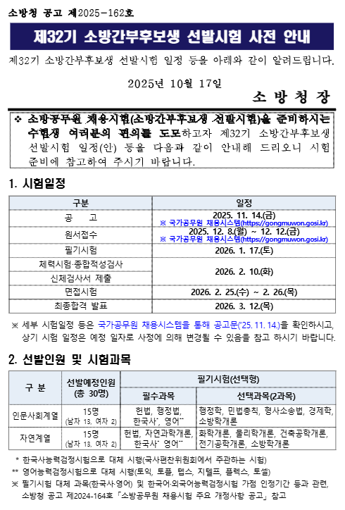 제32기 소방간부후보생 선발시험 사전안내가 소방청에 공고되었습니다.