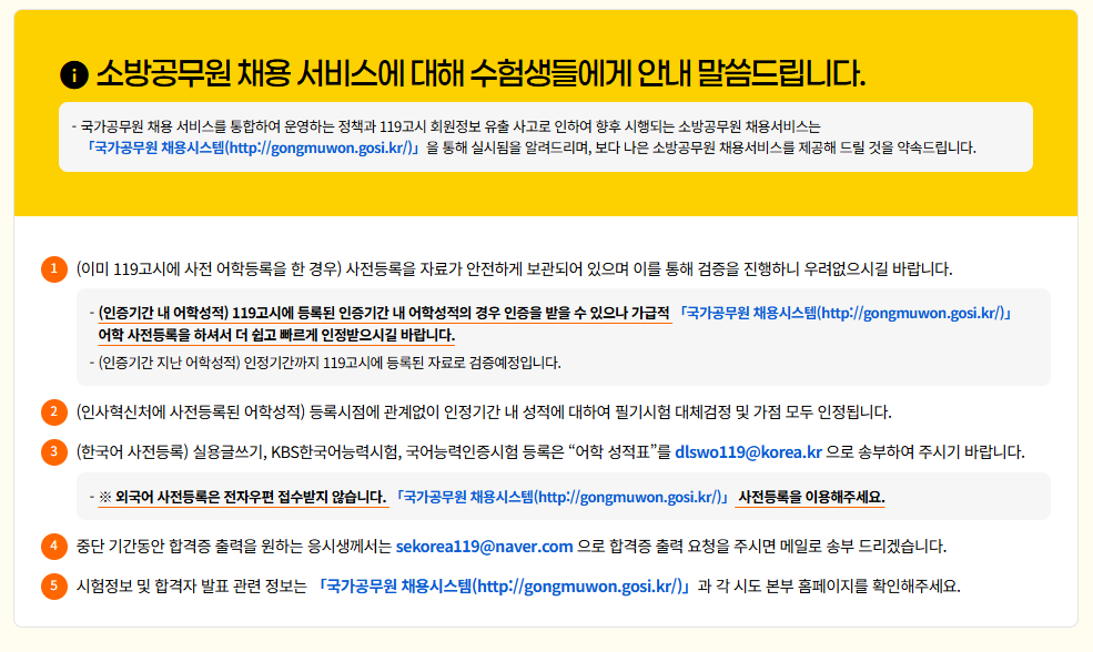 국가공무원 채용 서비스를 통합하여 운영하는 정책과 119고시 회원정보 유출 사고로 인하여 향후 시행되는 소방공무원 채용서비스는 「국가공무원 채용시스템(http://gongmuwon.gosi.kr/)」을 통해 실시됨을 알려드리며, 보다 나은 소방공무원 채용서비스를 제공해 드릴 것을 약속드립니다.