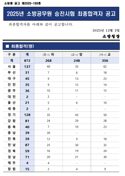 [소방][승진] 2025년 소방공무원(위·장·교) 승진시험 최종 합격자 발표