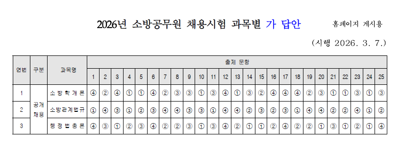 2026년 소방공무원 채용 필기시험 가 답안을 아래(붙임)와 같이 공개합니다.