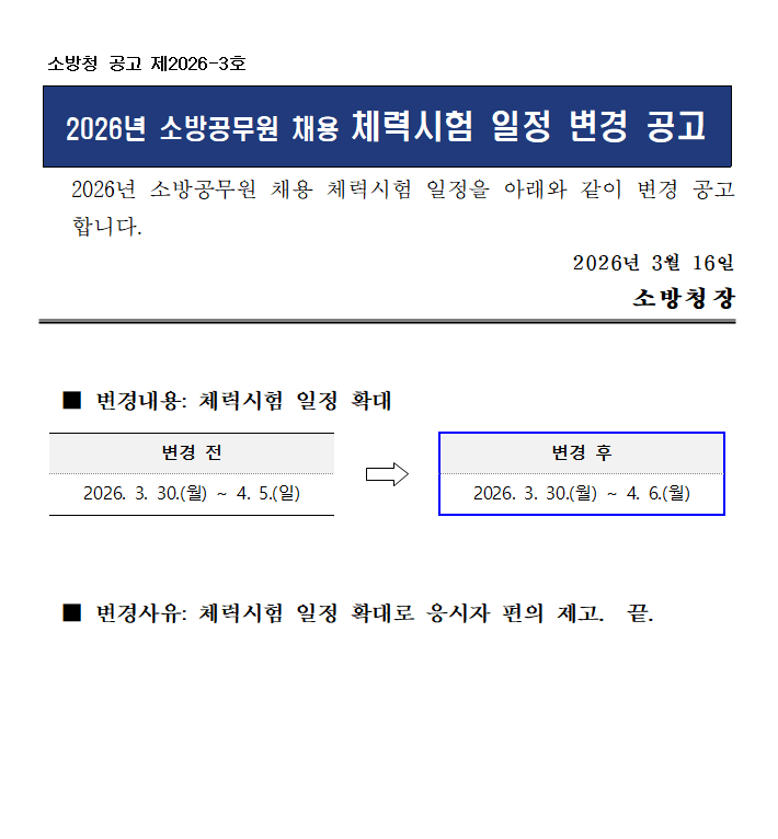 2026년 소방공무원 채용시험 체력시험 일정이 변경공고 되었습니다.