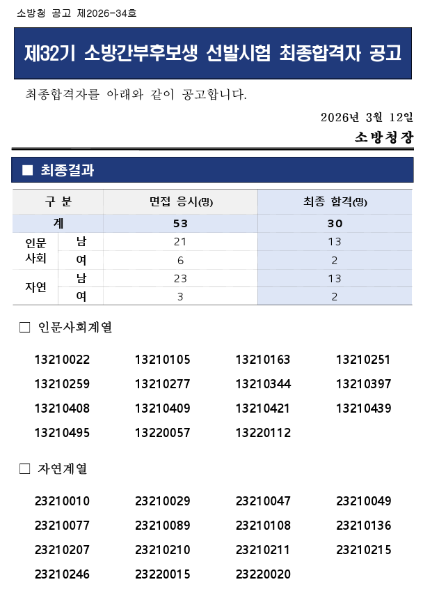 2026년 제32기 소방간부후보생 선발 최종합격자 공고가 발표되었습니다.