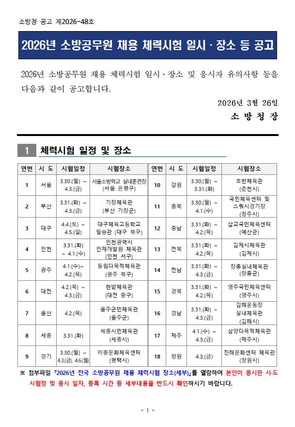 2026년 소방공무원 채용 체력시험 일시, 장소가 공고되었습니다.