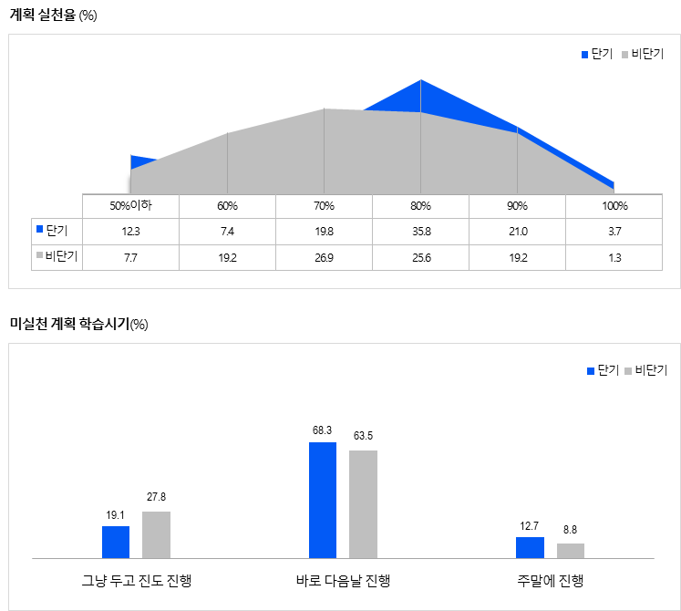 다만, 80%~100% 구간의 높은 실천율은 단기 합격생이 60.5%, 비단기 합격생이 46.1%로 나타나,