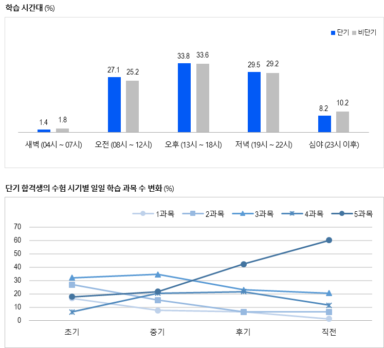 학습 시간대 분석 결과에 따르면, 단기 합격생을 기준으로 합격생들의 학습은 주로 오후33.8%로 가장 집중되었고,