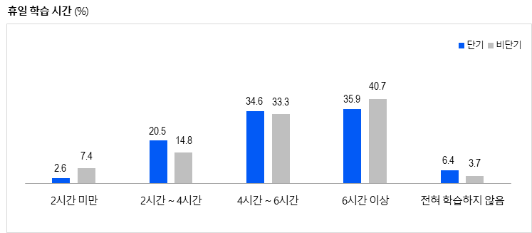 휴일에도 4시간 이상 학습을 한다는 응답이 단기 합격생 70.5%, 비단기 합격생 74%에 달했습니다.
