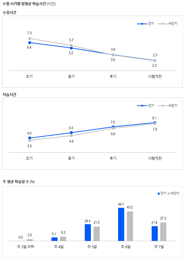 특히 시험이 임박할수록 강의 수강시간은 줄어드는 반면, 자습시간은 평균 8시간까지 증가하는 경향을 보였습니다.